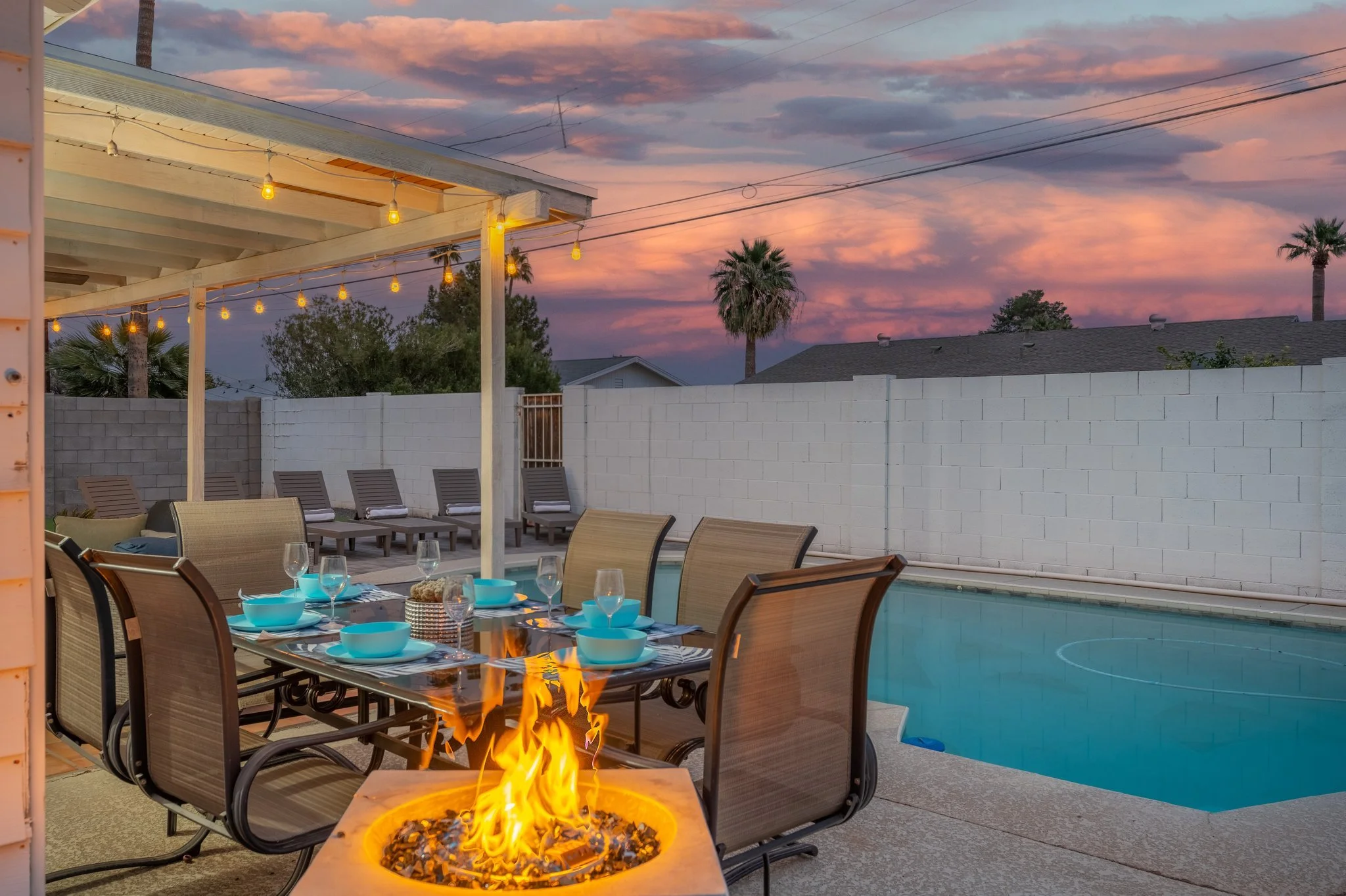 The backyard has a propane fire pit and propance space heaters available for your use. Please note, the firepit has to be manually lit. There are torch lighters in the top drawer of the kitchen island closest to the microwave. Additonal propane tanks are along the shared property wall on the south side of the yard.